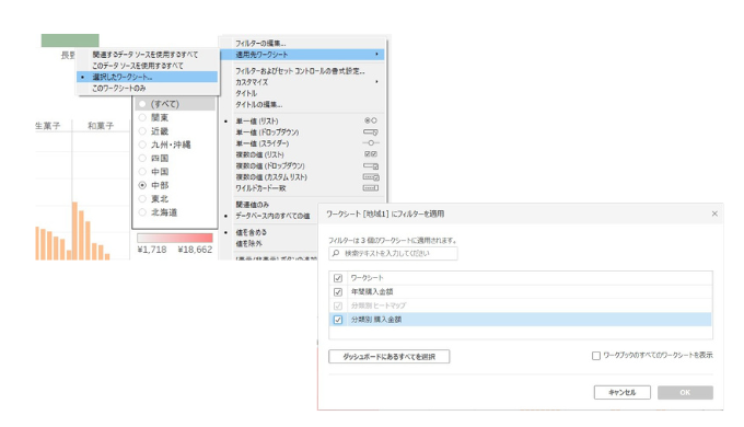 フィルタの横にある▼をクリックし、[適用先ワークシート] → [選択したワークシート] をクリックします。